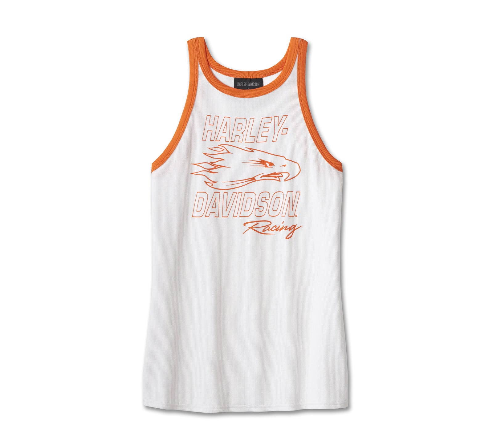 With its high neckline and racer back, our Limited Edition Screamin’ Eagle™ Ribbed Tank is a sporty sleepless pick. The soft cotton-modal rib delivers an incredible fit alone or for layering. Finished with contrasting trim and graphics that honor our record-setting Harley-Davidson™ Screamin’ Eagle™ Factory Team. Don’t snooze and lose—order this limited-quantity look before others beat you to it.